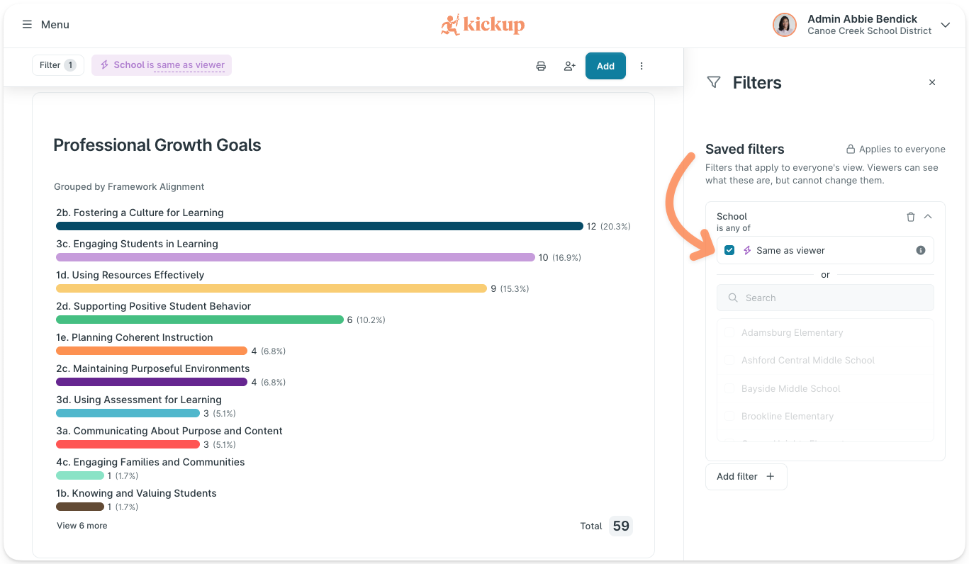KickUp's dynamic sharing lets district leaders build one dashboard and automatically deliver personalized, role-filtered views to every principal, coach, or department head — in a single click.